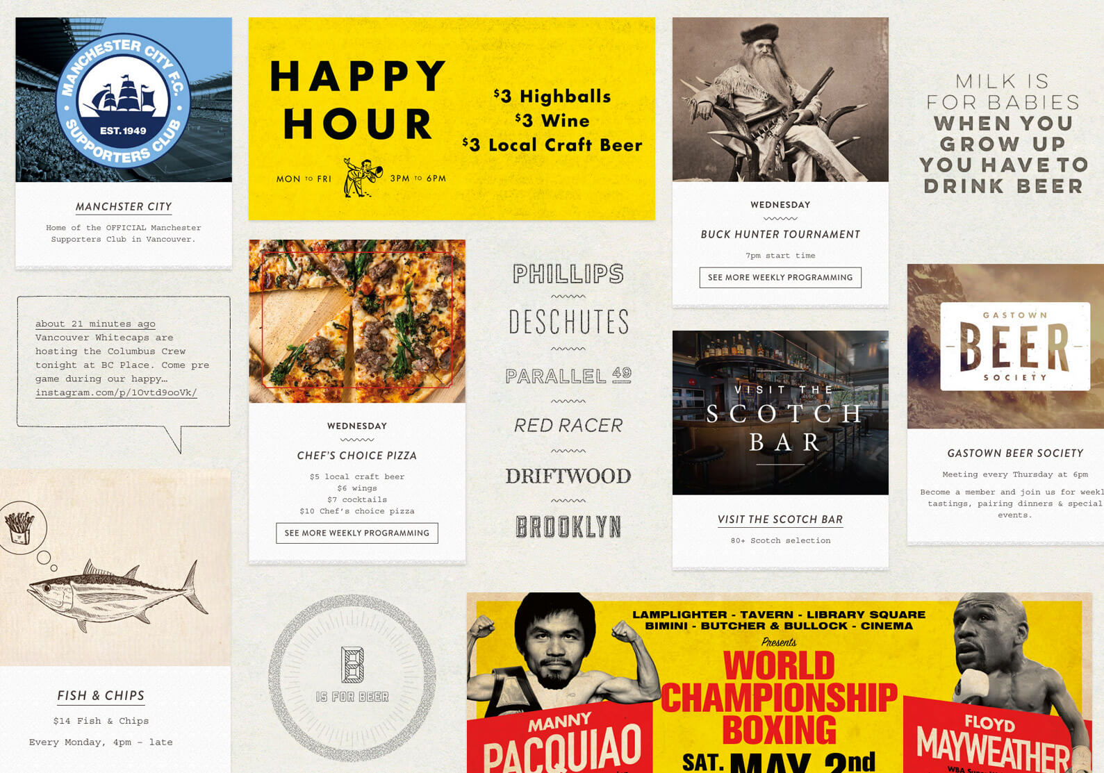 The Donnelly marketing team has to contend with some of the most varied content I've ever come across. One day they may be promoting a marquee football game while the next is a one-off cask event. The unpredictable nature of time sensitive content created a unique challenge in the organization and design of the new site. How do you build a framework that is easy to manage on the backend, logical in presentation for users and able to accommodate any type of content you can throw at it? After much debate and experimentation we settled on a tile system for the presentation of information on key pages of the website. This solution provides maximum flexibility; tiles can be moved anywhere on the page while containing any type of content.