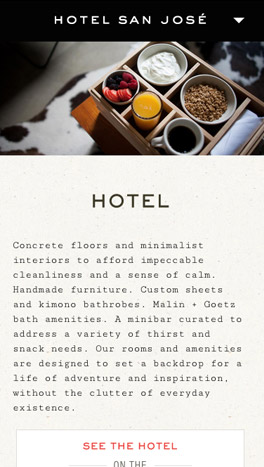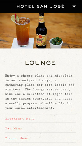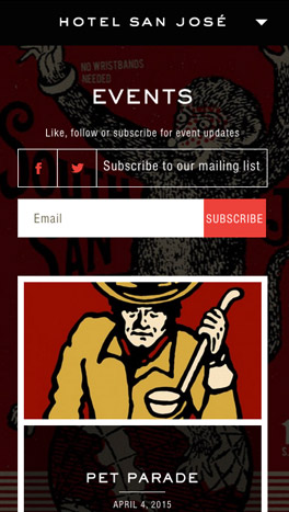 Because the San Jose has a lounge with weekly programming that appeals to travellers and locals alike it was important the new site serve the needs of mobile visitors. We built the site on a responsive framework to ensure folks on the go received the best possible experience.