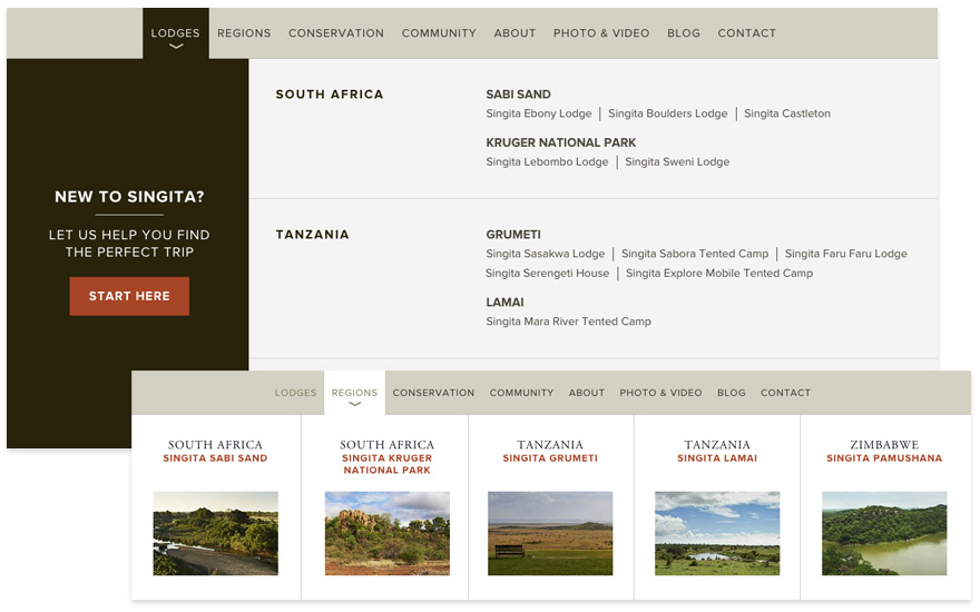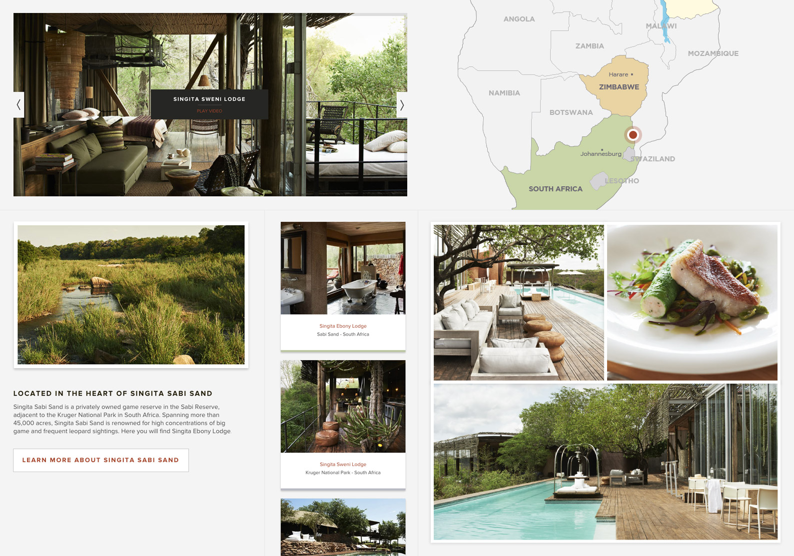 Great effort was made to help visitors unfamiliar with Singita orient themselves quickly. Because there are so many options available we had to develop pathways for users so they could easily understand and isolate the experiences of greatest relevance.